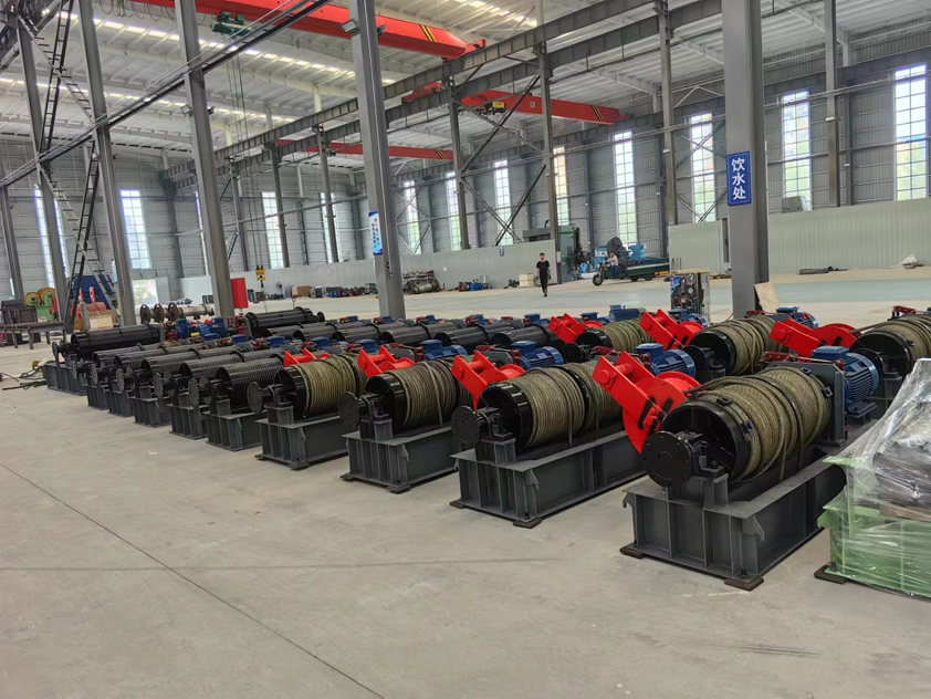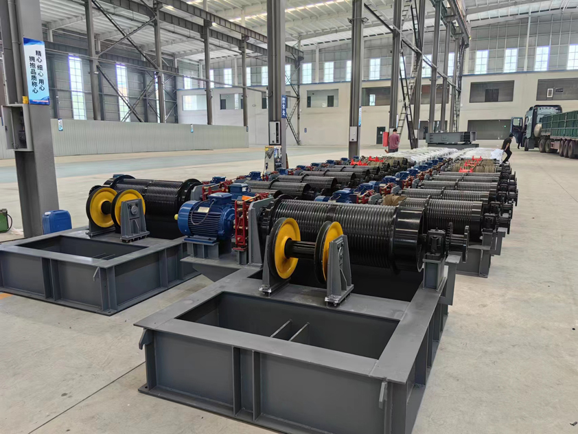 采用行星轮系连接左右卷筒,主轴由电机驱动齿轮带动旋转,通过行星减速机构将动力分配至两个卷筒。这种结构可确保两卷筒始终保持同步转动,避免传统双卷筒卷扬机因齿轮组不同步导致的磨损和故障问题。 12